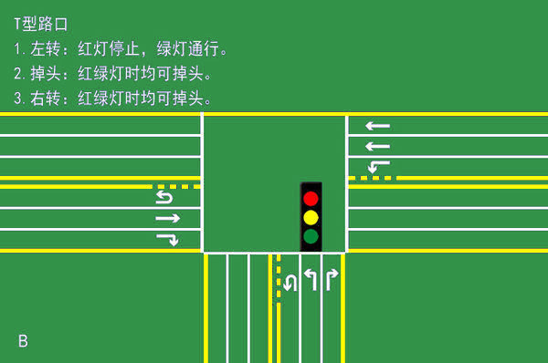 B類:掉頭車輛不依賴紅綠燈情況,左轉(zhuǎn)時(shí)確保安全;左轉(zhuǎn)車輛依據(jù)紅綠燈通行(紅燈停、綠燈行);右轉(zhuǎn)車輛也不依賴紅綠燈。