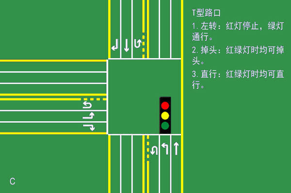 C類:掉頭車輛不依賴紅綠燈情況,左轉(zhuǎn)時(shí)確保安全;左轉(zhuǎn)車輛依據(jù)紅綠燈通行(紅燈停、綠燈行);直行車輛也不依賴紅綠燈。